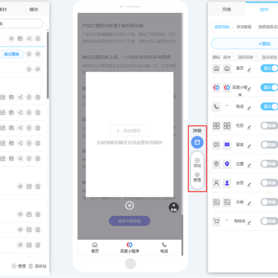 小程序新增彈窗容器,便于在小程序首頁或欄目彈窗顯示活動(dòng)圖片,推薦廣告等。彈窗容器中可以添加圖片,文字,按鈕,支持疊層操作。彈窗支持豐富的自定義樣式彈窗打開方式支持兩種,1、觸發(fā)式(通過點(diǎn)擊某個(gè)文字、按鈕、圖片打開) 2、頁面加載完自動(dòng)打開(支持首頁,空白欄目頁等)彈窗建好后,也可以通過查找鏈接的方式打開彈窗,如給某個(gè)文字,圖片,按鈕增加鏈接觸發(fā)打開彈窗。二、服務(wù)器升級(jí)提升網(wǎng)站、小程序、后臺(tái)訪問速度上周我們對(duì)系統(tǒng)服務(wù)器進(jìn)行了全面升級(jí)(提升20%至50%)主要包括:網(wǎng)站訪問服務(wù)器集群(共享主機(jī)及獨(dú)享主機(jī))小程